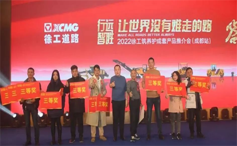 下午5點,全體人員到七一世外桃源酒店召開了成都地區(qū)高端客戶答謝會暨2022徐工筑養(yǎng)護成套化產(chǎn)品推介會。徐工機械黨委書記、總裁助理、道路機械事業(yè)部總經(jīng)理崔吉勝同志發(fā)表以“徐工道路——讓世界沒有難走的路”為主題的講話。創(chuàng)豐公司總經(jīng)理劉勇發(fā)布了2022年徐工路面新設(shè)備,并對購機優(yōu)惠政策作了解讀。董事長楊曉進對現(xiàn)場來訪領(lǐng)導(dǎo)及客戶表達了感恩之情,并表示創(chuàng)豐公司將一如既往對徐工路面使用企業(yè)給與最大的支持。本次活動中,會長何均擔(dān)任頒獎嘉賓。